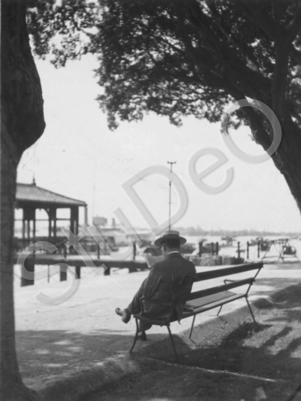 Beschreibung: „Herr Mitteroecker (Österr) beim Lesen seines franz. Romans auf Insel Shameen. Im Hintergrund engl. Brücke, von wo aus wir gewöhnlich nach Ha Fong Tsuan (Berliner Mission) fahren.
