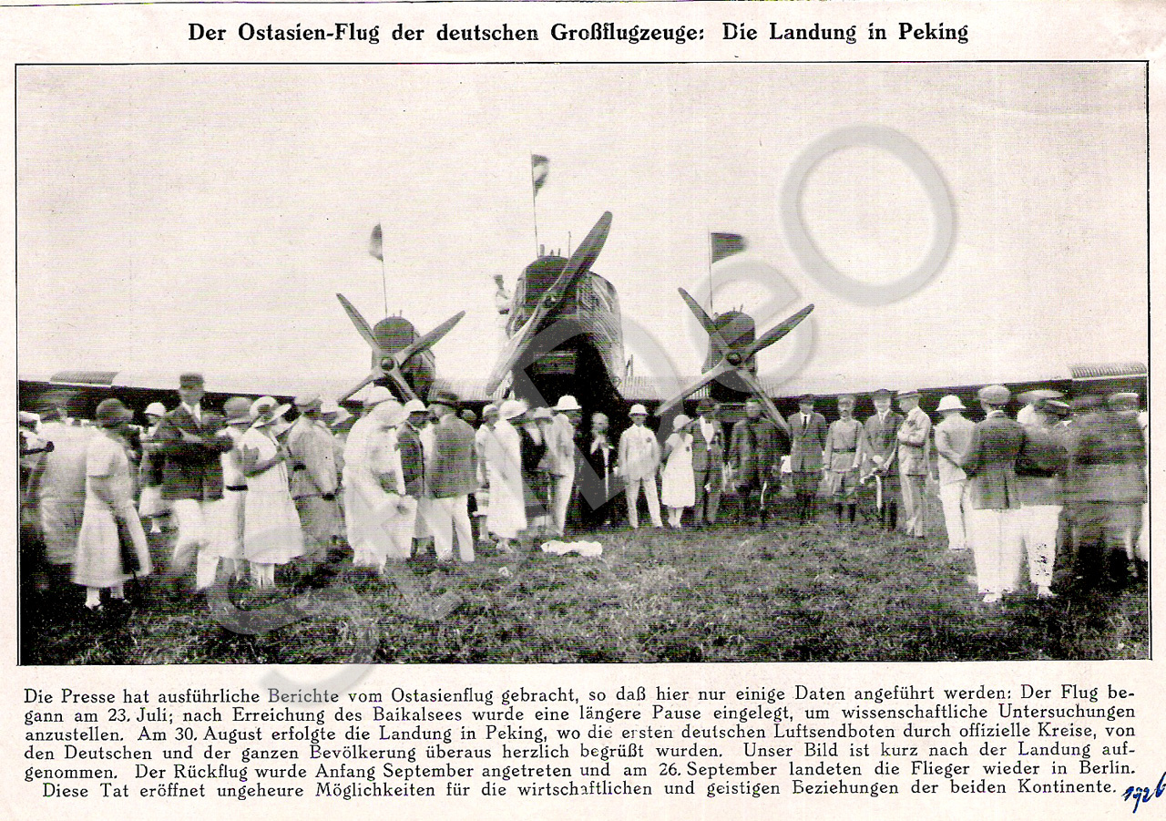 Beschreibung: Aufnahme vom 30.08.1926, kurz nach der Landung des deutschen Großflug­zeugs in Peking. Am 23. Juli gestartet in Berlin, Aufenthalt am Beikalsee, um wissenschaft­liche Untersuchungen zu machen. Anfang September begann der Rückflug mit Ankunft in Berlin am 26.Sept.1926.