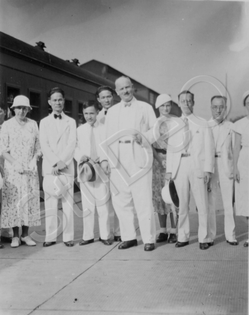 Beschreibung: Verabschiedung von Prof Dr. Bernhard Martin zum Heimaturlaub am Bahnhof Canton am 14.07.1934. v.l.n.r.: Madeleine Martin (Bernhards Frau), Ass. Dr. Fung, Dolmetscher Tai En-Wing, Ass. Dr. Chen, Prof. Martin, Eleonore Martin (Tochter), Ass. Dr. Chi, Ass. Dr. Yen und Ilse Martin (Tochter). Die 4 Assistenten sprachen die verschiedenen in und um Canton gesprochenen Dialekte, um für die Patienten zu dometschen. Foto: Oberarzt Dr. Hsü Fu-lü (Aussenseiter, weil aus der Provinz Chekiang).