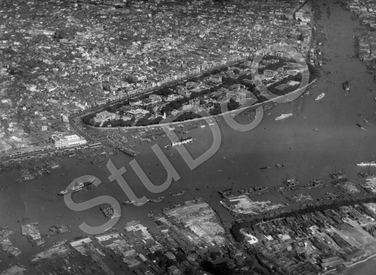Beschreibung: Hauptsächlich Insel Shameen mit der englischen und französischen Konzession. Shameen ist umgeben vom Kanal Defence Creeck und dem Perlfluß. Im Hintergrund die Stadt Canton.