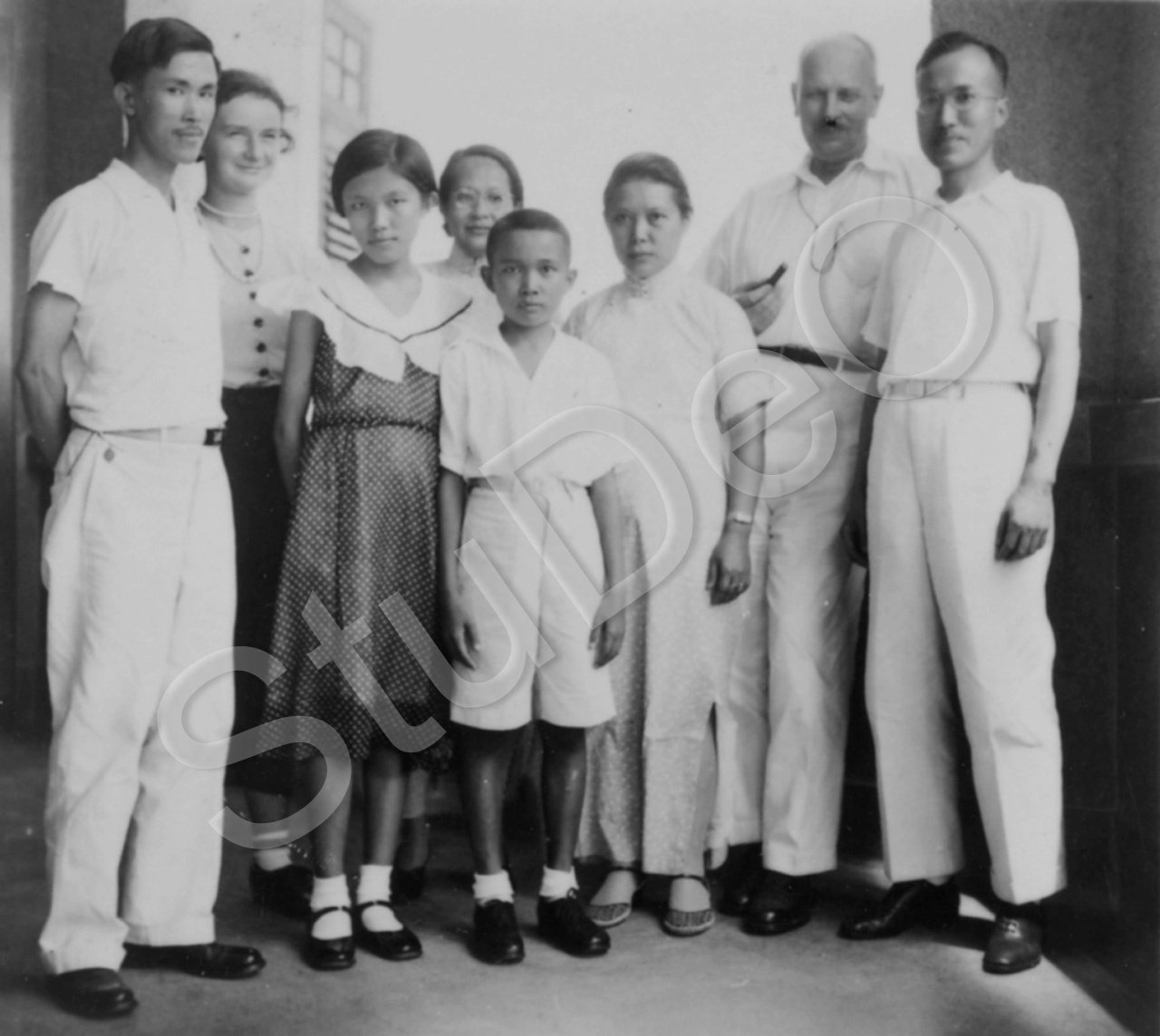 Beschreibung: Prof Dr. Bernhard Martin, Caton, besucht seine Patientin, die Tochter Sun Yatsens, in Macao im Hause ihres Bruders Sun Fo. v.l.n.r.: Dr. Tai, Canton, Bruder von Sun Yatsens Schwiegersohn und Hausfreund von Prof. Martin; Ilse Martin (Tochter); Tochter von Sun Yatsens Tochter; Sun Fos Frau; Sohn von Yatsens Tochter; Sun Yatsens Tochter; Prof. Martin; Tai En-sai, Sun Yatsens Schwiegersohn.