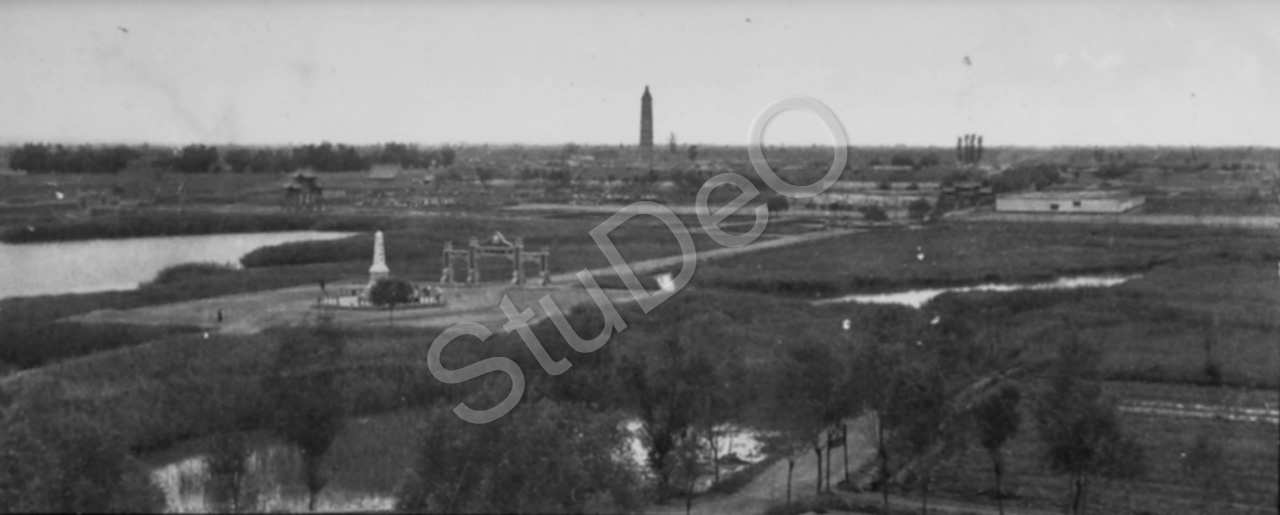 Beschreibung: Blick auf eine Ebene mit See, hohe schlanke Pagode, Pailu (Ehrenbogen) zu einer Statue (s. auch P5605).