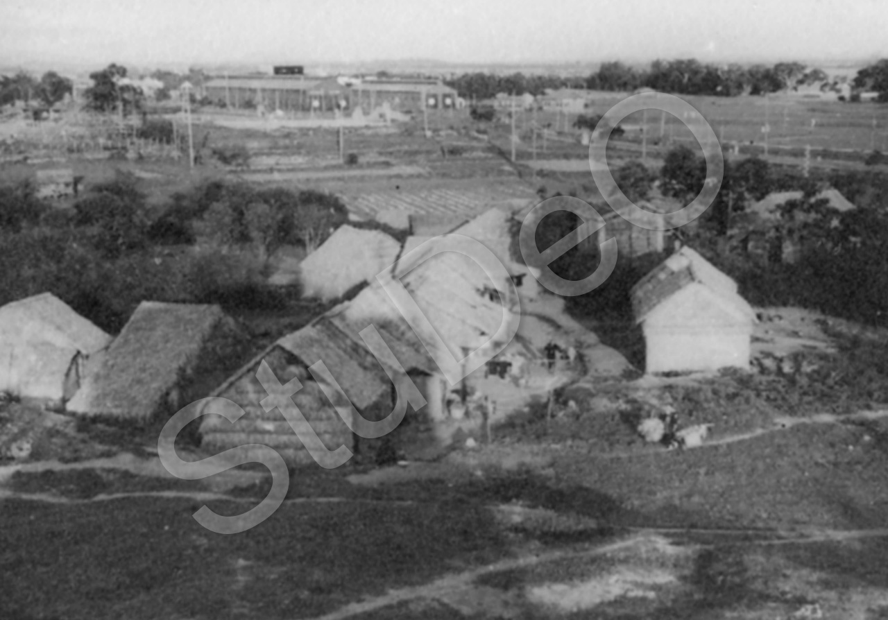 Beschreibung: Blick vom Wohnhaus von Prof. Günther Huwer - in einem Vorort von Kan­ton - nach Osten auf eine Ebene, vorne Bauernhäuser.