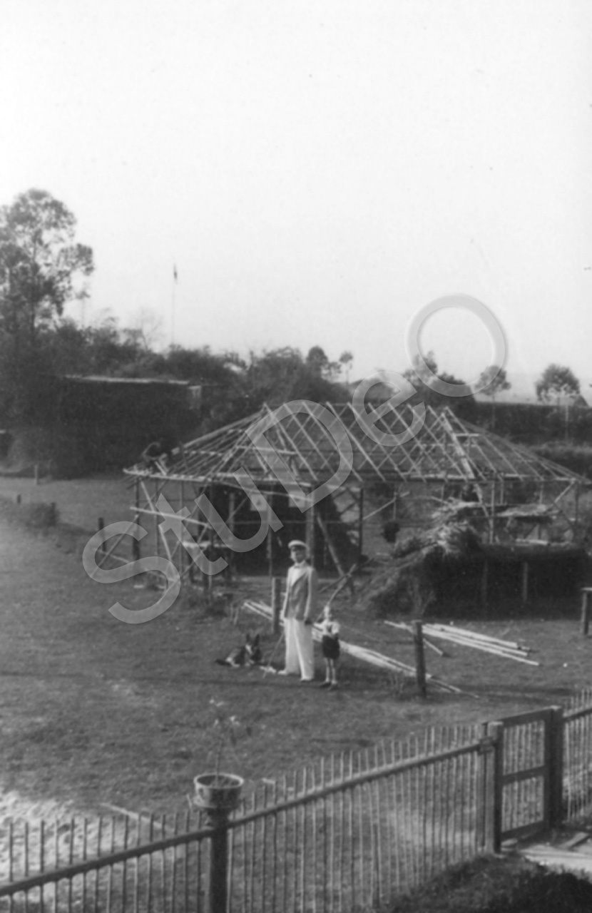 Beschreibung: Hermann Huwer mit Jochen Lehmann und Schäferhund Kyon bei einem Schuppengerüst, Stallungen?