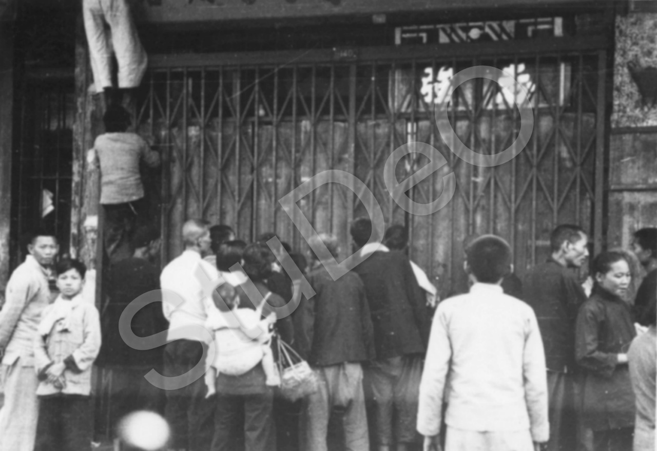 Beschreibung: Plünderer nützen die Angriffe der Japaner am 23.10.1938, sie versuchen in einen vergitterten Laden einzudringen.