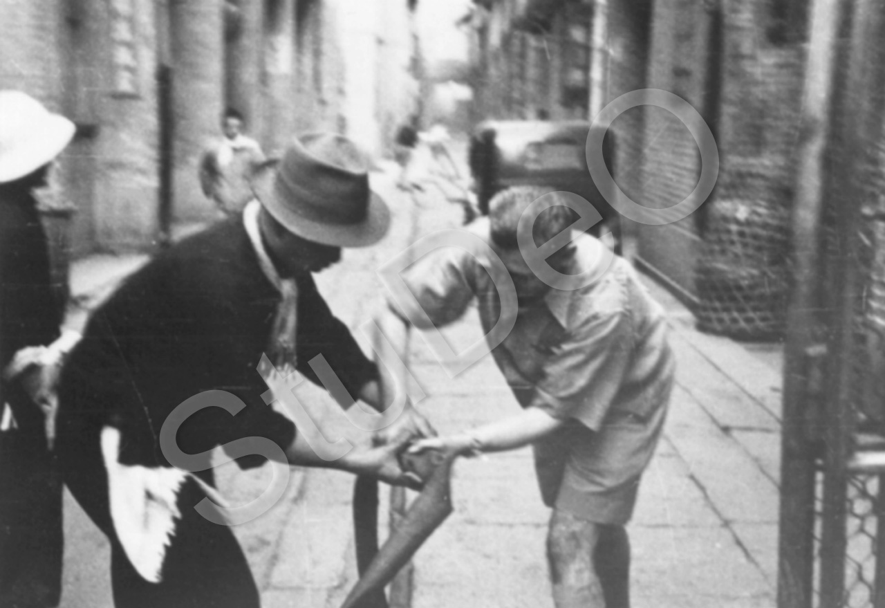Beschreibung: Deutsche und Chinesen verlegen Druckschläuche zum Löschen der Brände in der Tung Hing Straße am 23.10.1938.