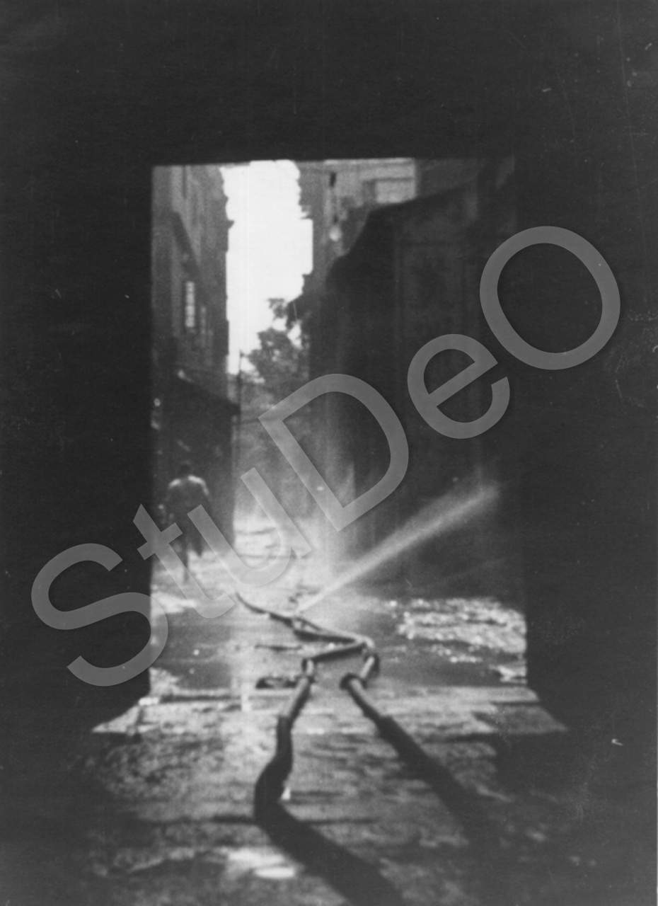 Beschreibung: „Die undichten Druckschläuche“ in.enger Gasse zwischen Westbauten am 23.10.1938.