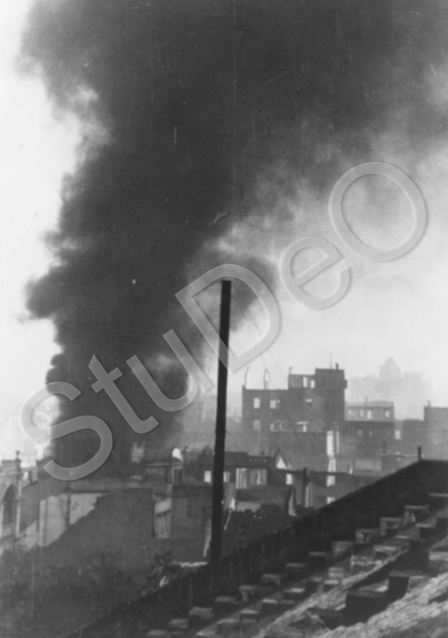 Beschreibung: Blick vom Dach des Lagerhauses Carlowitz auf die Brandstellen nach Osten am 26.10.1938.