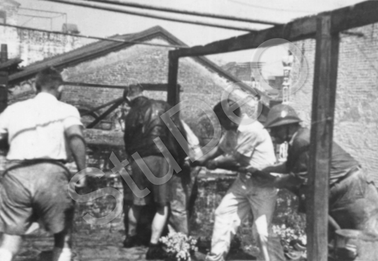 Beschreibung: Carlowitz Mitarbeiter ziehen Druckschläuche auf ein Dach am 26.10.1938.