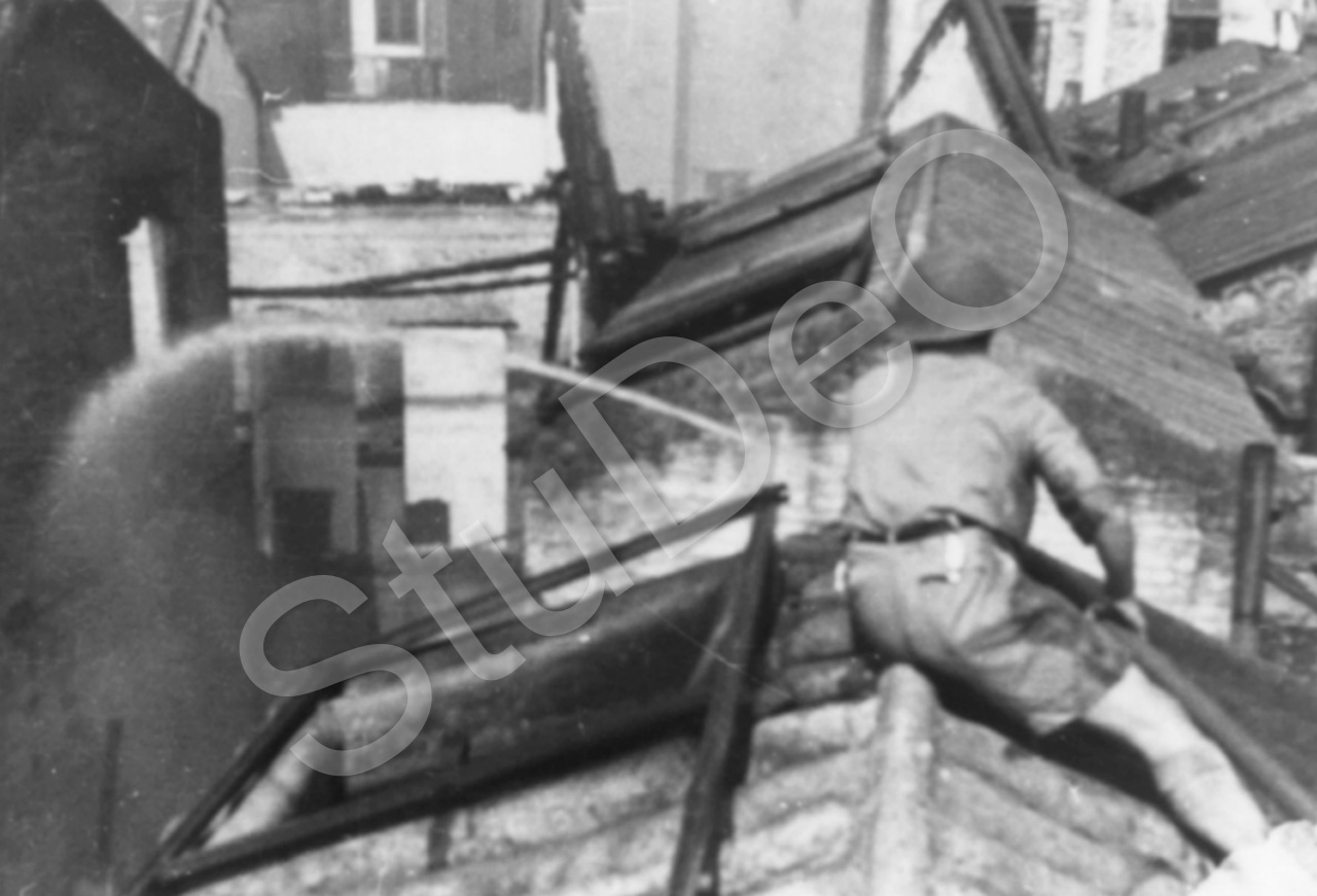 Beschreibung: Carlowitz Mitarbeiter auf dem Dach sitzend löschen mit Druckschlauch am 26.10.1938.