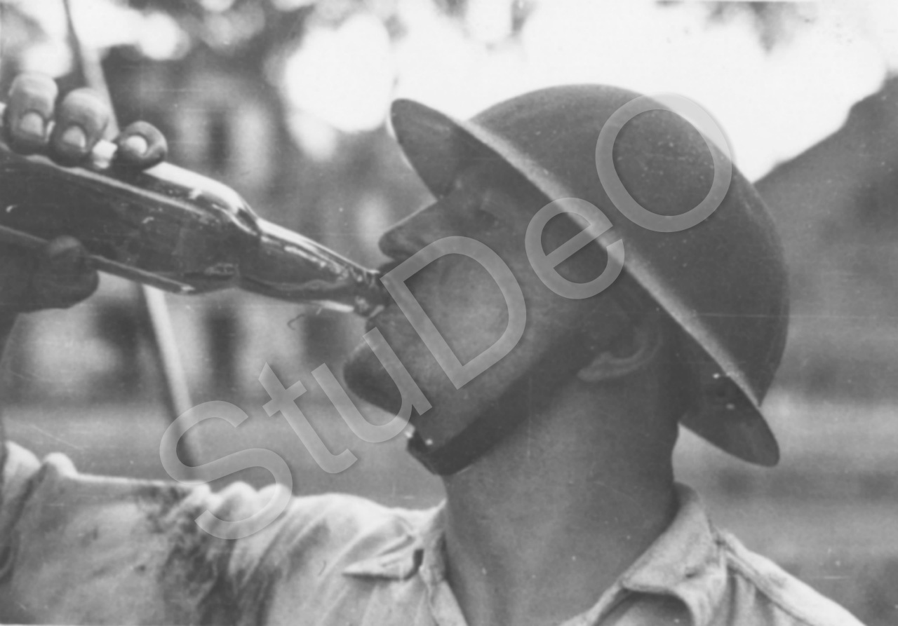 Beschreibung: Carlowitz Mitarbeiter aus der Flasche trinkend am 26.10.1938. Während der Lösch­ar­bei­ten.
