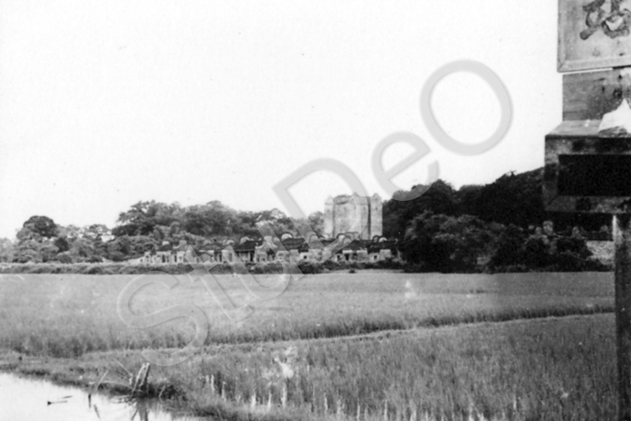 Beschreibung: Reisfelder, Dorf und große Monumente.