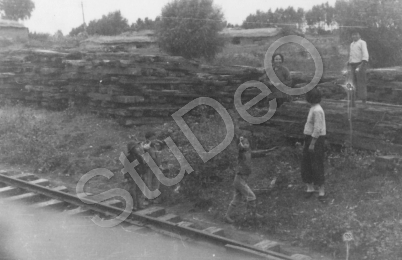 Beschreibung: Chinesenkinder spielen zwischen Eisenbahnbohlen. Vorne Eisenbahn­schiene, im Hintergrund chin. Bauernhäuser.