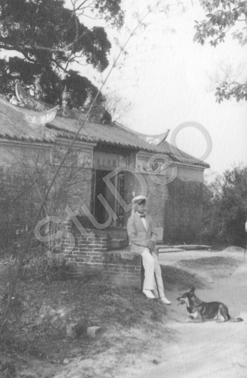 Beschreibung: Hermann Huwer mit Prof. Günther Huwers Schäferhund, Kyon, rastet an einem Bauernhaus in der Umgebung von Kanton.