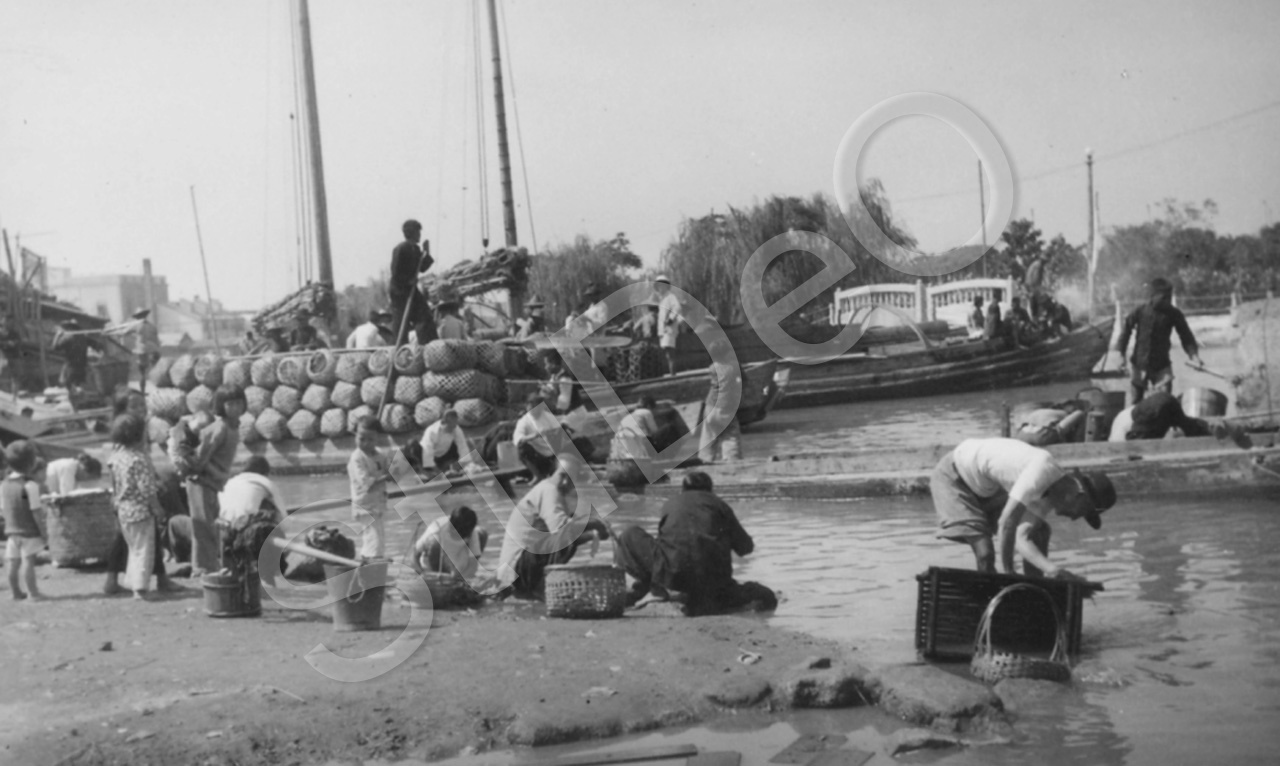 Beschreibung: Reges treiben: Be- und Endladen von Booten, Waschen, am Perlfluß in Kanton.