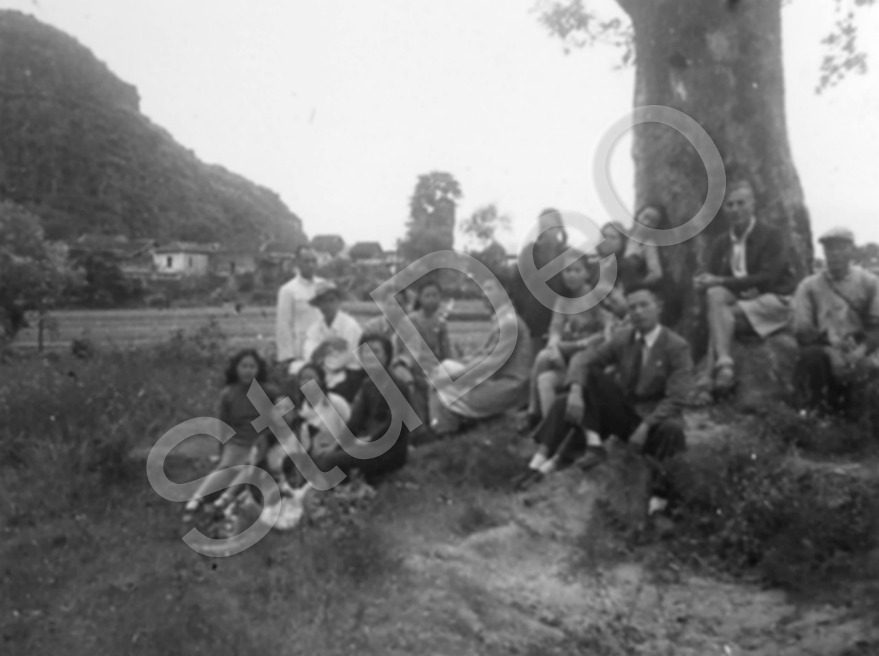 Beschreibung: Ausflug mit Assistenten und Studenten der Medizinischen Hochschule in die Umgebung von Kweilin = Guilin.. Prof. Günther Huwer sitzt am Baum.