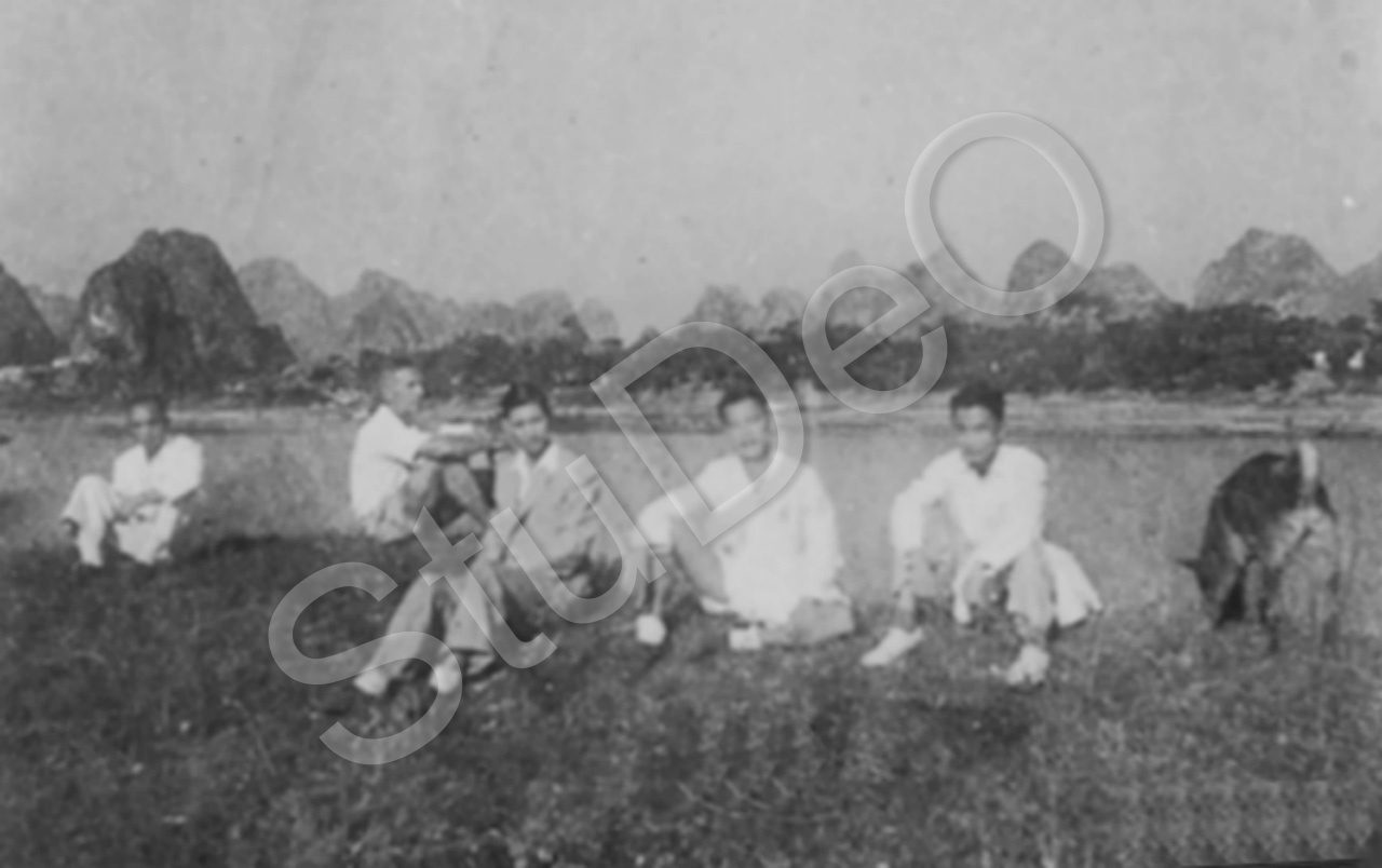 Beschreibung: Prof. Günther Huwer 2. v.li., ?,  Dr. Xiao Zheng Medizinischen Hoch­schu­le Kweilin = Guilin am Lijiang Fluß, Hinten die Bergkulisse.