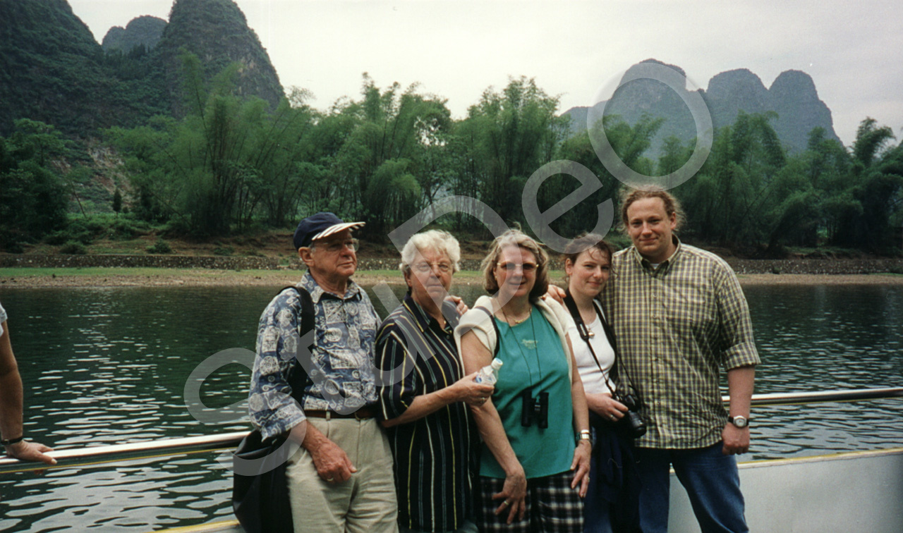 Beschreibung: v.l. Max Kupka mit Frau Elinor und Tochter Gitti und Enkelin Anke mit Mann Thomas auf einem Schiff auf dem .Lijiang Fluß in Guilin am 17.05.1999.