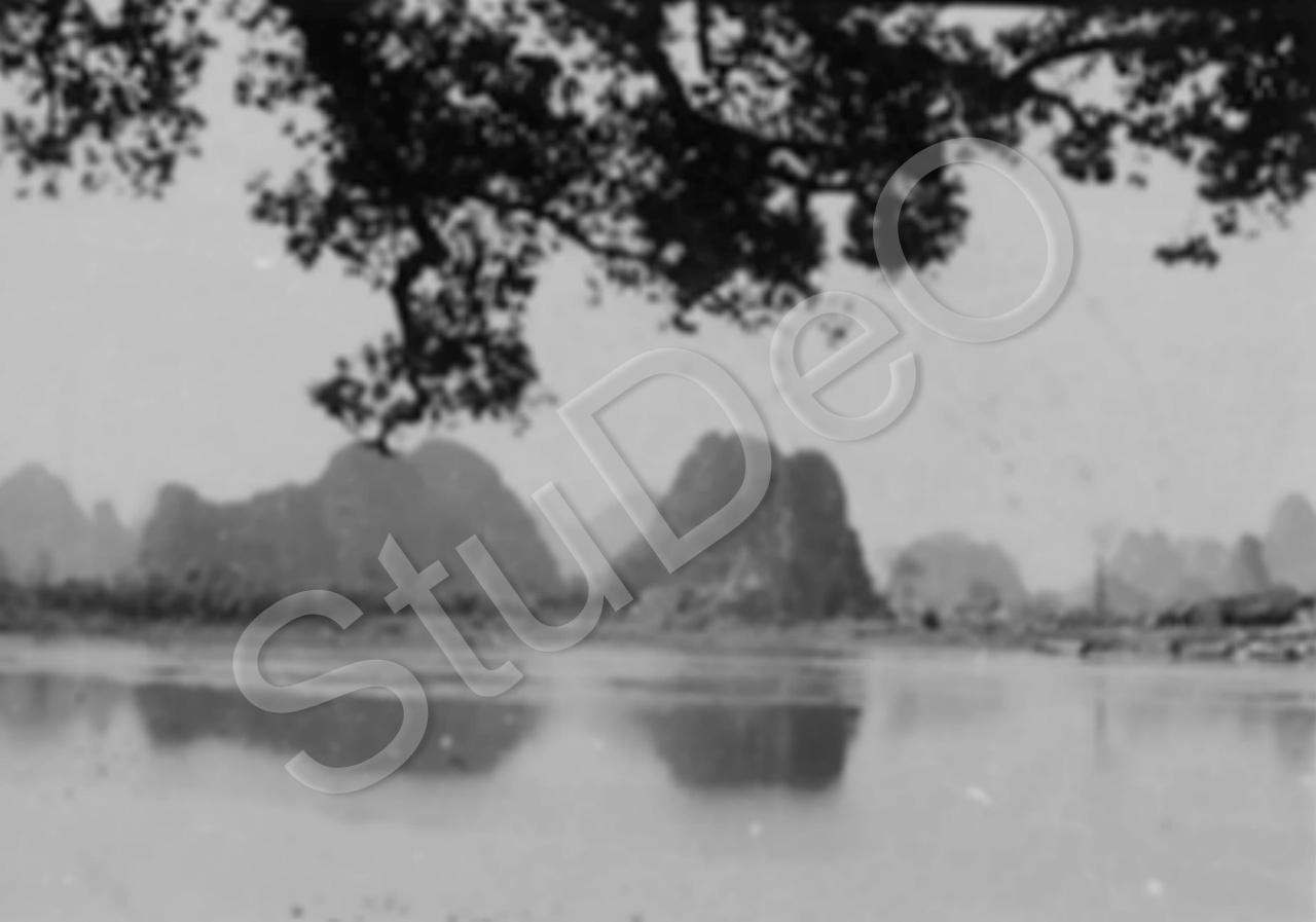 Beschreibung: Blick vom Wasser auf die Berge von Kweilin = Guilin.