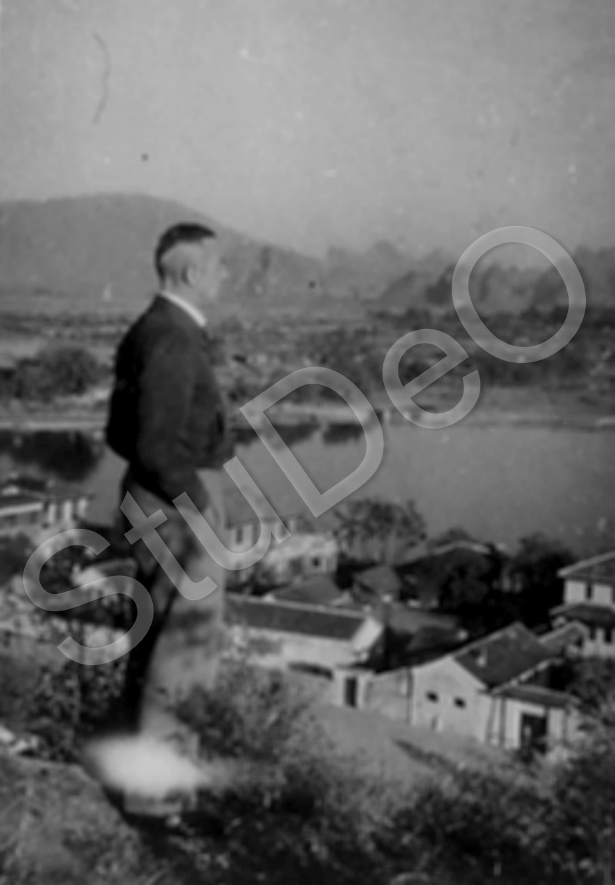 Beschreibung: Prof. Günther Huwer guckt von einem Hügel aus auf den Lijiang Fluß? Häuser europäischen Stils, Kweilin = Guilin.