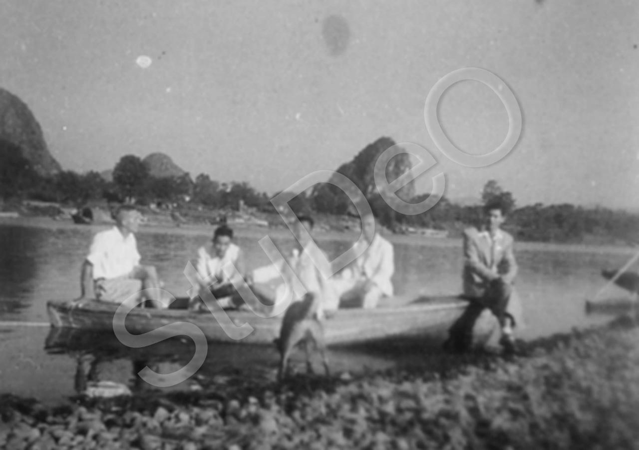 Beschreibung: Prof. Günther Huwer vermutlich mit Kollegen aus der Medizinischen Hochschule mit Boot unterwegs auf den Lijiang Fluß? Kweilin = Guilin.