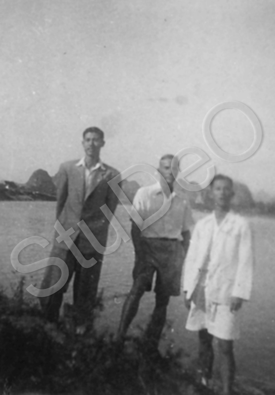 Beschreibung: Prof. Günther Huwer mit 2 Kollegen aus der Medizinischen Hochschule vor Fluß- und Bergkulisse. Kweilin = Guilin.