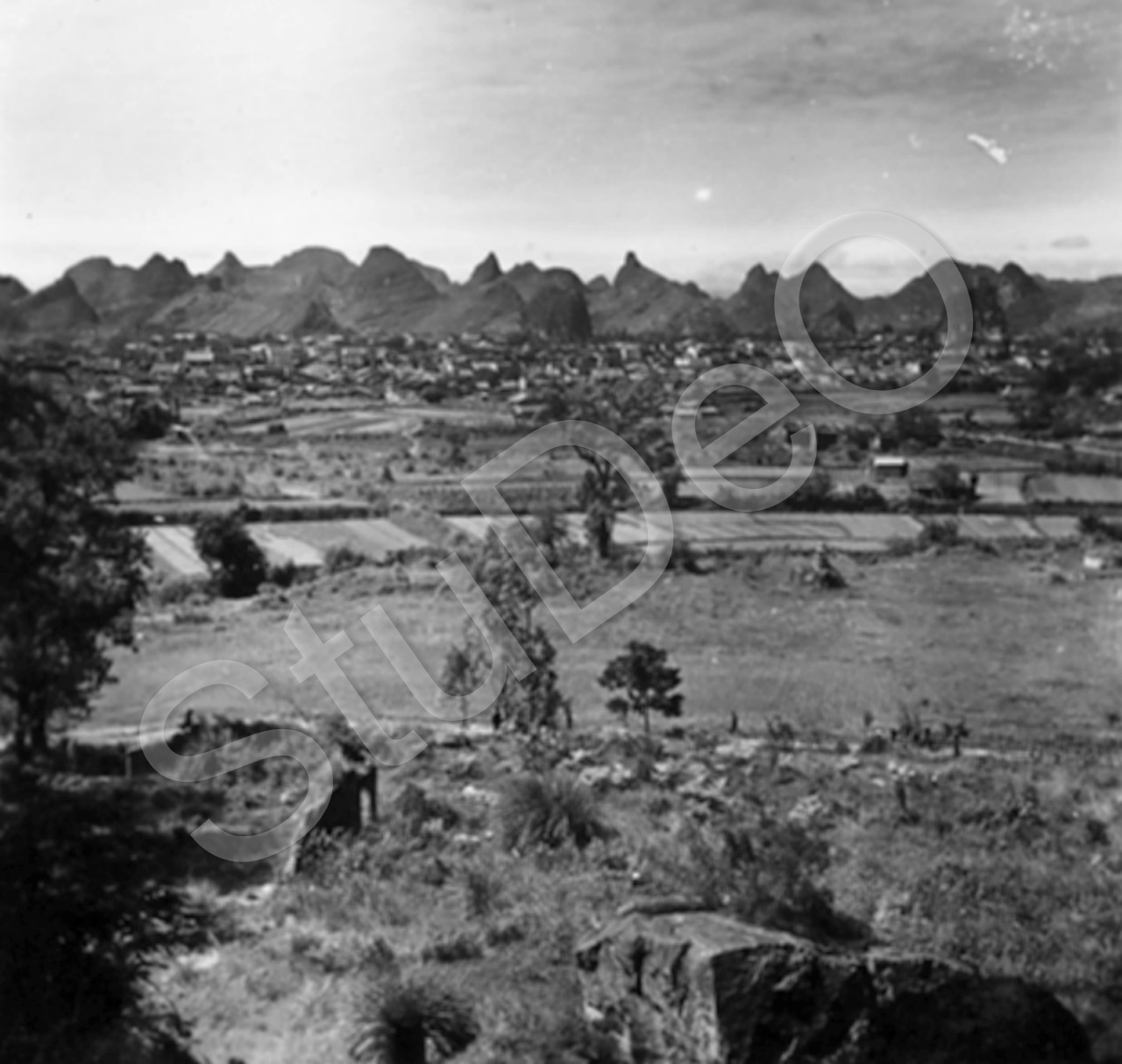 Beschreibung: Sehenswürdigkeiten entlang des Lijiang Flusses, Prov. Kwangsi (neu Guanxi). Fluß mit Berg und Dorf im Hintergrund. „Wan-Wu“, Kweilin = Guilin.