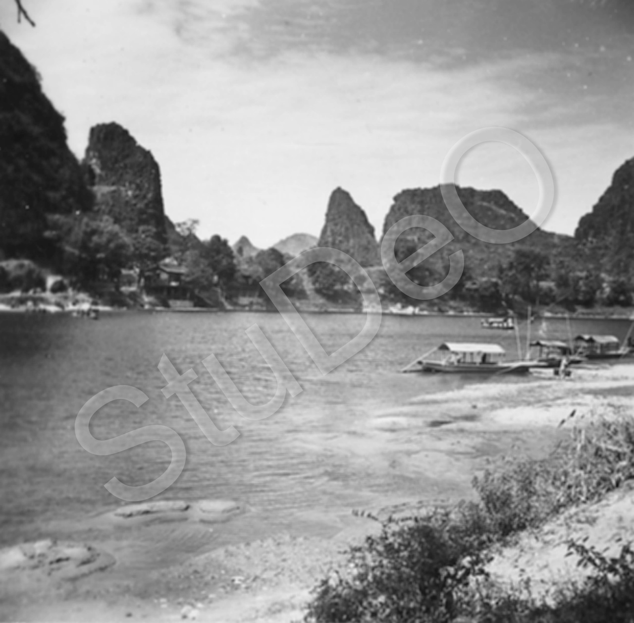 Beschreibung: „Li Chiang“, neu Lijiang Fluss, Prov. Kwangsi, neu Guanxi. Zuckerhut- Berge im Hintergrund, Boote. Kweilin = Guilin.