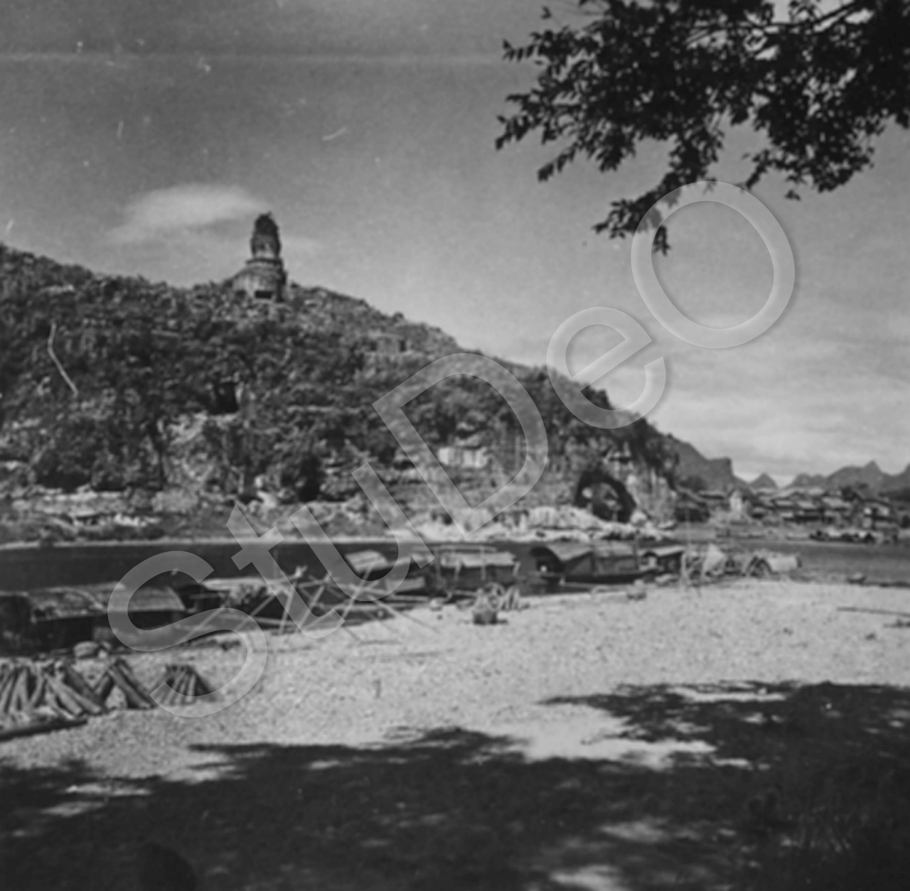 Beschreibung: „Hsiang Pi Shan“ neu: Xiangbi Shan, Elefantenrüsselberg. Pagodenruine auf dem Berg, rechts im Hintergrund Häuser der Stadt Guilin (Kweilin).