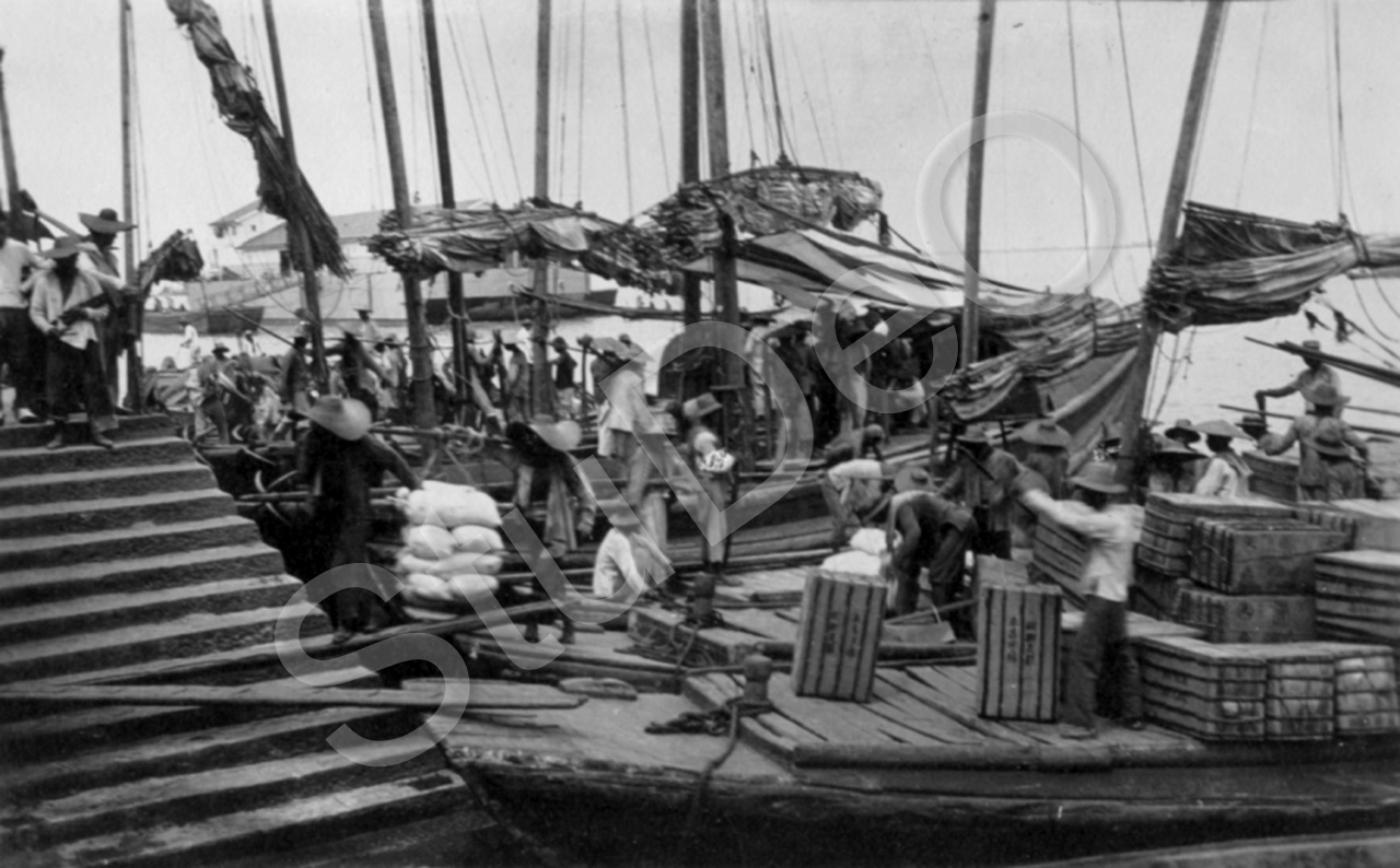 Beschreibung: Hafen von Hankau (Hankow, neu: Wuhan). Dschunken liegen im Hafen und werden gelöscht oder es wird Handel darauf getrieben.