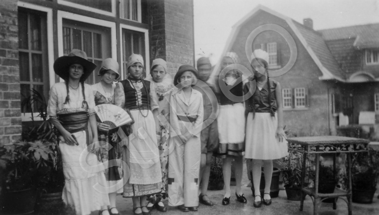 Beschreibung: Martha Kleins Geburtstag auf der Terrasse der Fam. Klein v.li.n.re. Mari­an­ne und Hildegard Kress, Martha Klein, Ingrid Günther, Glatzer, ?, Gertrud Glatzer (Mutter ist Japanerin). Sichtbar rechts das Missionshaus.