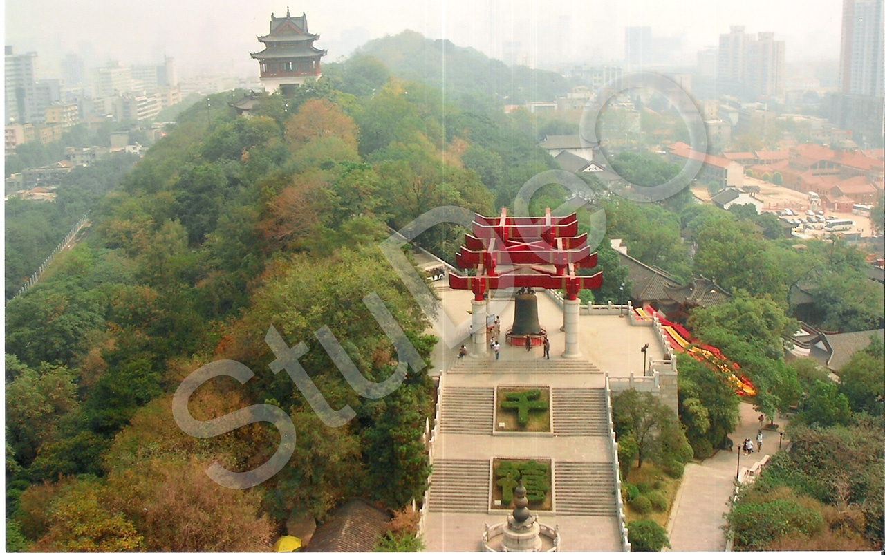 Beschreibung: Pavillon mit großer Glocke auf dem Hongshan-Hügel im Hintergrund die Stadt Wuchang.
