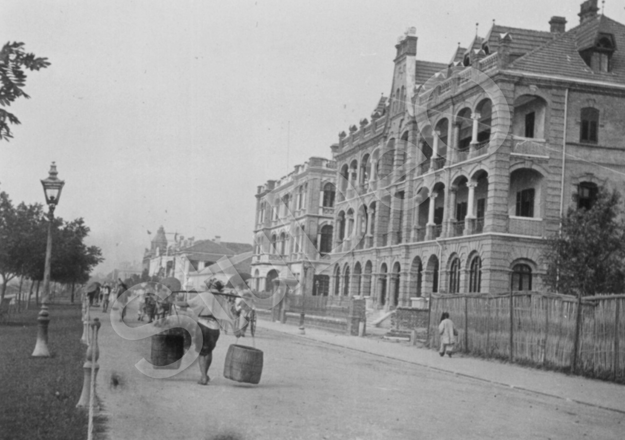 Beschreibung: Lastenträger und europäische Gebäude auf der Prinz-Heinrich-Ufer, von Norden aus fotografiert.