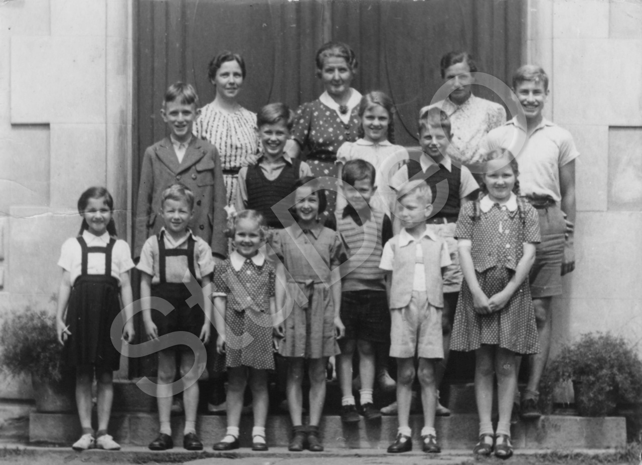 Beschreibung: Schuljahr 1935/36 vor der Eingangstür der Dt. Schule Hankow. Lehrerin: Hanna Alinge geb. Werder (aus Bielefeld), li.ob. Karl Otto Klein.