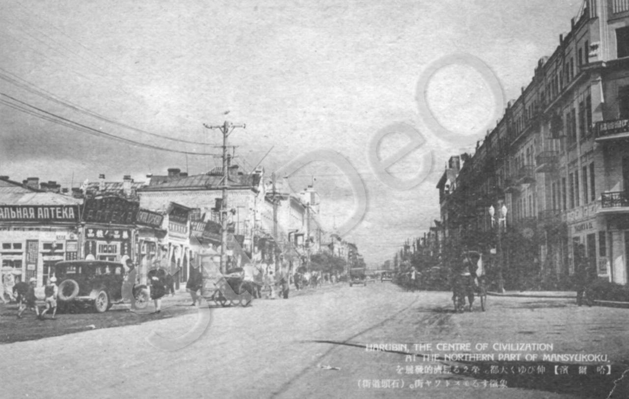 Beschreibung: Postkarte: „Harbin, the centre of civilization at the northern part of Mansyukoku” Straße im Zentrum von Harbin. Rikshas, Autos, Häuser im Weststil, Ladenbeschriftung russisch.