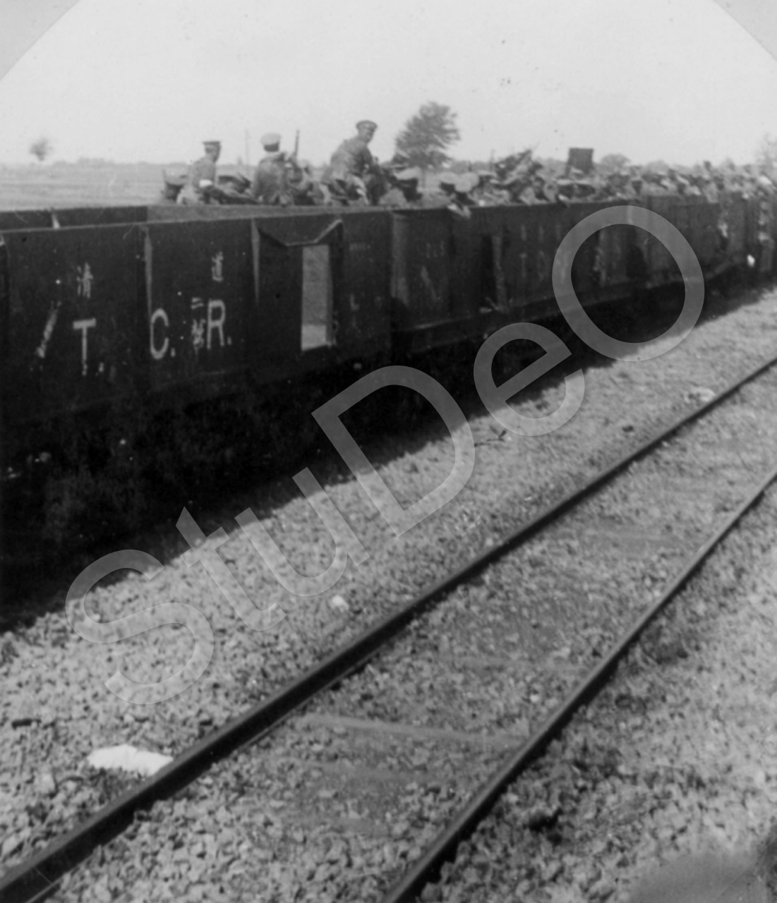 Beschreibung: Honanfeldzug, chin. Truppentransporte im Güterzug.