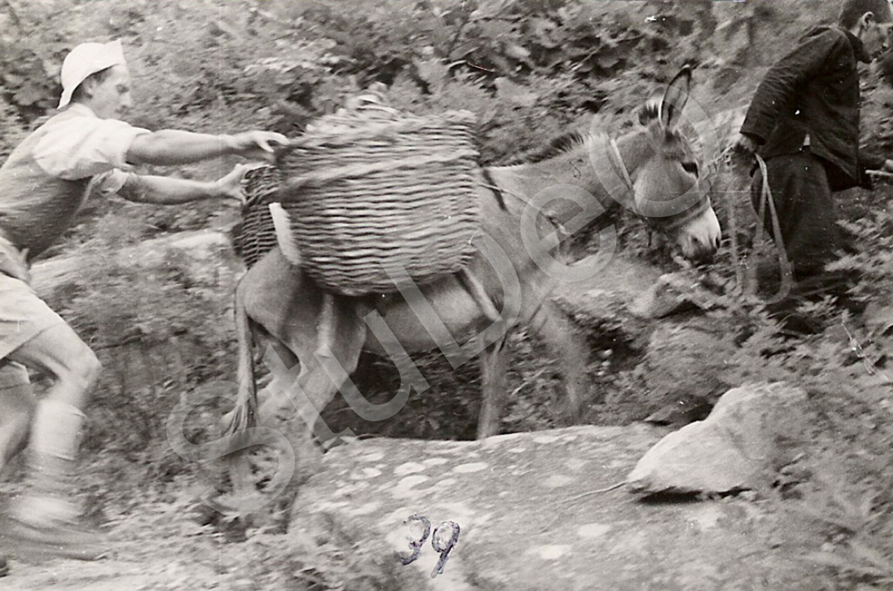 Beschreibung: Pastor Wolfgang Müller hilft einem Esel aufwärts in den Bergen im Grenzgebiet zur Mongolei. Der Esel  wurde zum Transport der Ausrüstung von 4 Wanderern genutzt. Dr. Biller (Schulleiter Ti), Zeichenlehrer Bryantzeff und Lehrer Gustav Steenken.