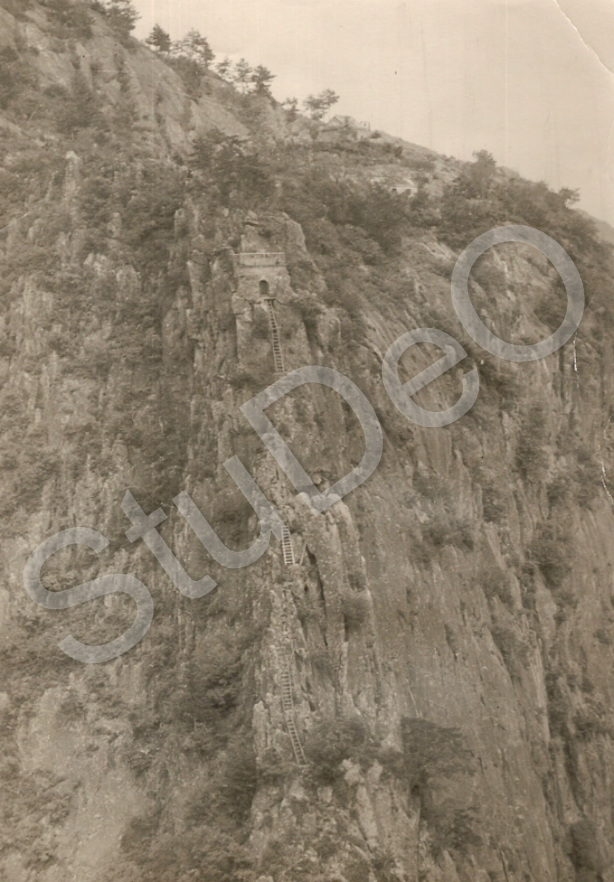 Beschreibung: Berg im Grenzgebiet zur Mongolei. Steilwand mit Leitern zu einem Tempel auf einsamer Höhe. Bergtour mit Pastor Wolfgang Müller (Tientsin), Gustav Steenken (Lehrer in Peking).
