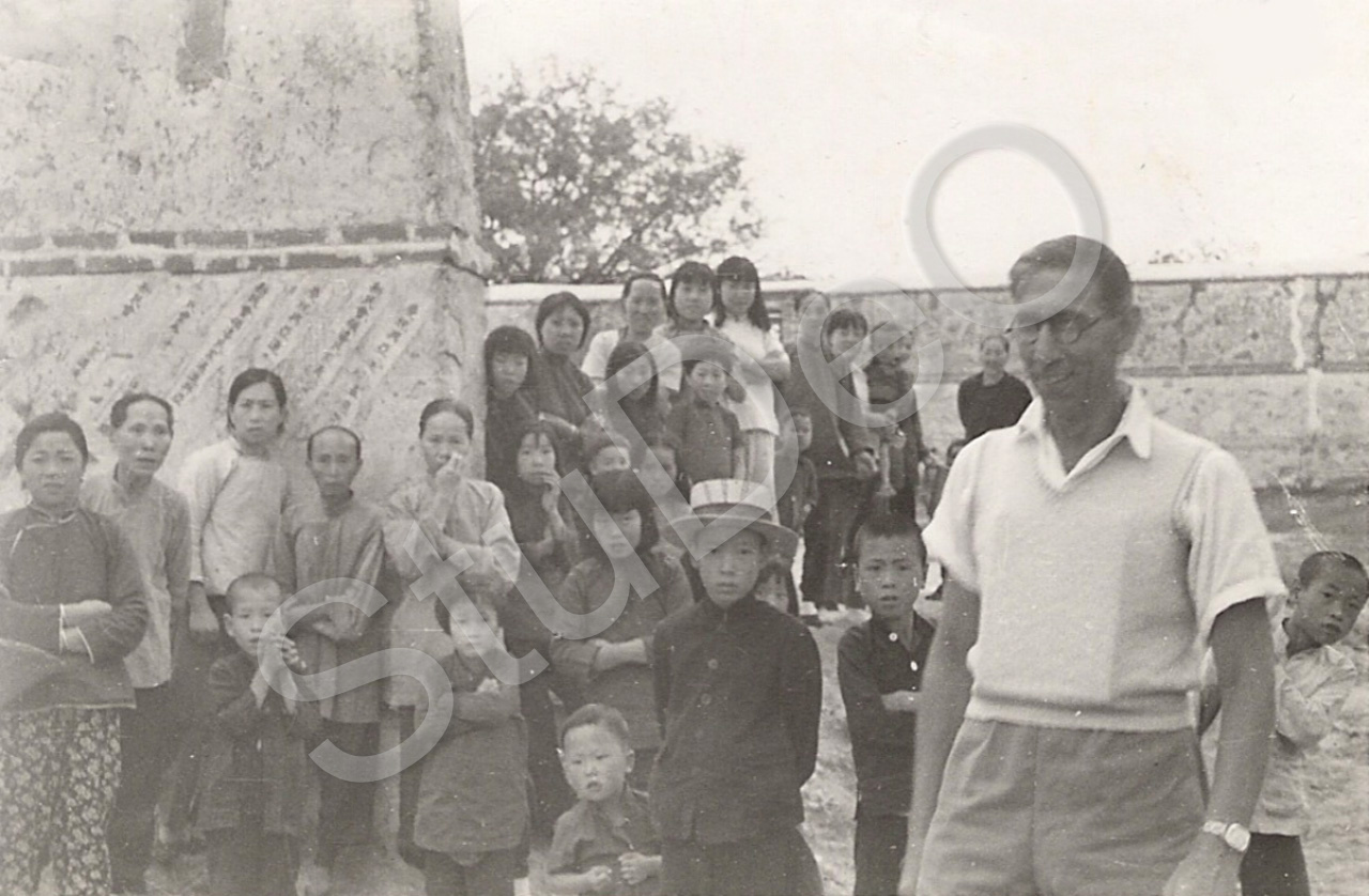 Beschreibung: Auf der Wanderung in den Bergen im Grenzgebiet zur Mongolei. Kunster­zie­hungs-Lehrer Victor Bryanzeff (Dt. Schule Tientsin) begegnet Dorfbewohner.