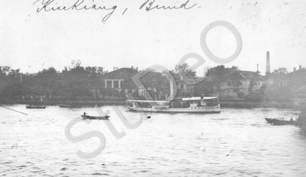Beschreibung: Der Bund von Kiukiang (neu Jiujiang). Schiff und Fischerboote.