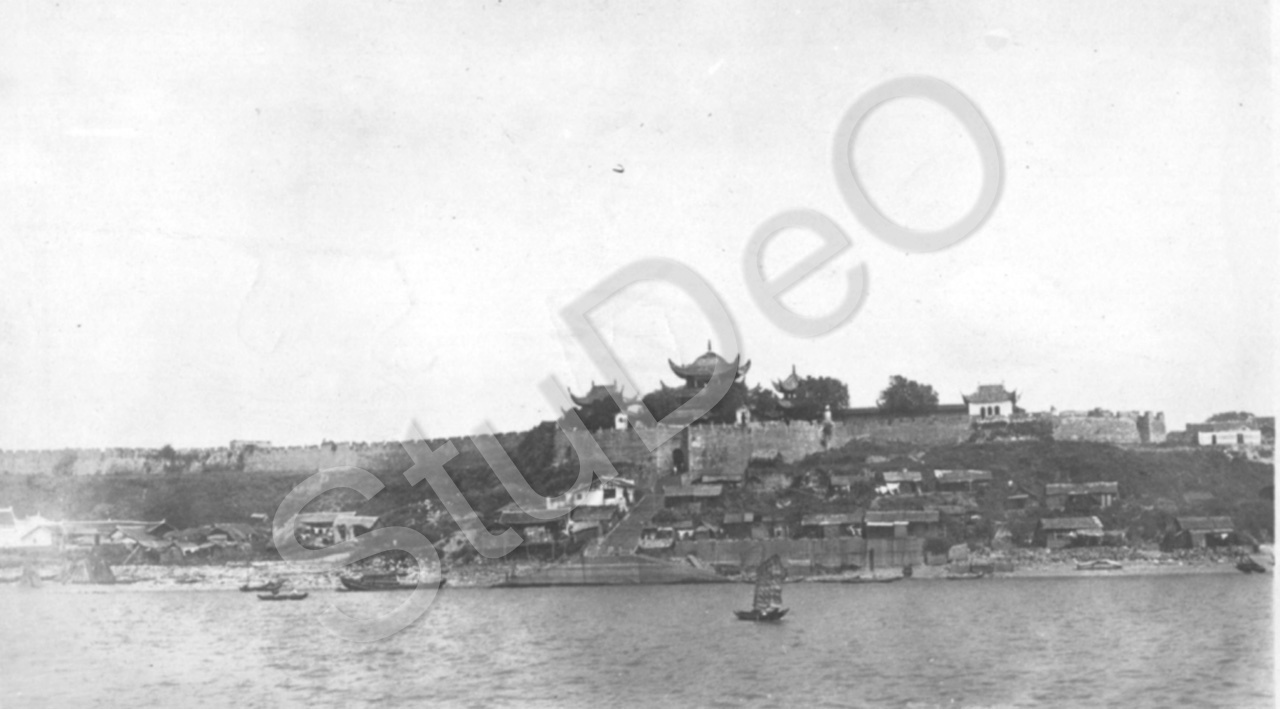 Beschreibung: Yochow. Häuser bis an das Wasser gebaut, z.T. als Pfahlbauten. Stadtmauer.