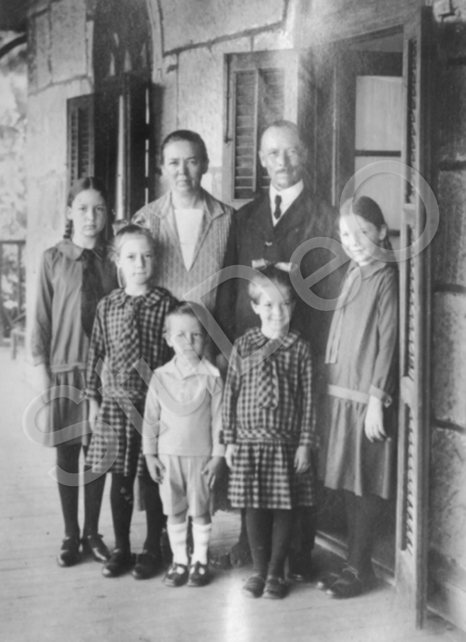 Beschreibung: Missionar David K. Steybe mit seiner Frau und ihren Kindern, v.l.n.r. Berta, Ruth, Hans, Martha und Friede in Kuling.