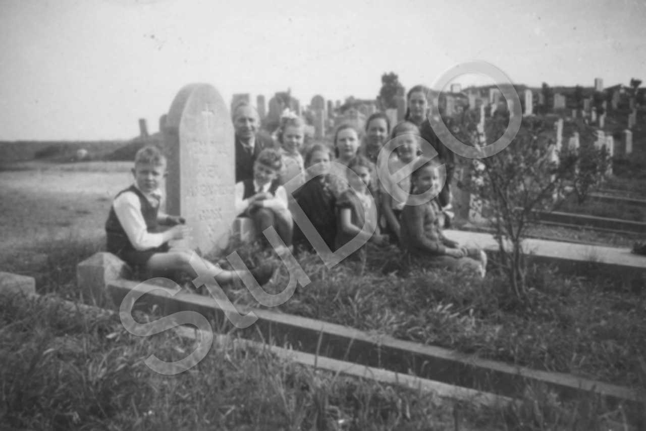 Beschreibung: Missionarskinder mit Missionar Paul Tröster und Berta Stybe am Grab von Vera Paul auf dem Christenfriedhof in Changcha am 16.11.1946. Inschrift am Stein: „Amen. I.A. Mein Glück ist gross“.