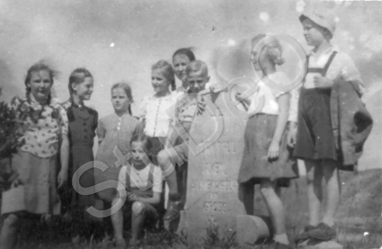 Beschreibung: Missionarskinder am Grabstein von Vera Paul auf dem Christenfriedhof in Changcha.