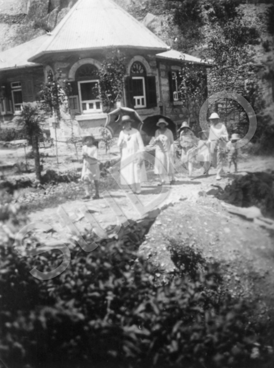 Beschreibung: Missionarsfrauen gehen mit Kindern spazieren. Sommerhaus in Kuling.