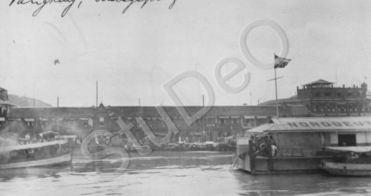 Beschreibung: Schiffanlegeplatz in Nanking  Schwimmdock mit der Aufschrift „Nordeutscher Lloyd“.