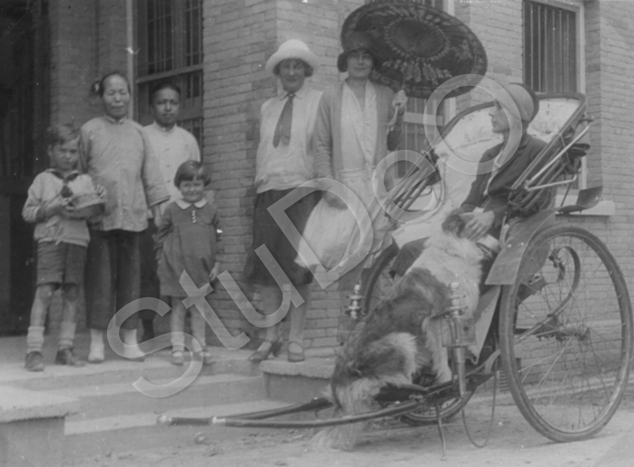 Beschreibung: Vor Wohnhaus v. Simon-Eberhard in Kaolumen-Str.: v.l. Burghard Lehmann (Sohn d. Militärberaters), Amah, Tochter Ilse S-E, Diener Tschu, Erika S-E, Frau Elena Lehmann (mit Schirm), Frau Weber.