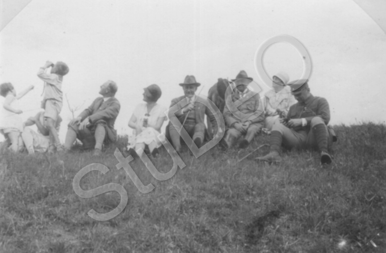 Beschreibung: Karfreitag, Zuschauer bei einer Felddienstübung: Kinder Ilse Simon-Eberhard u. Burghard Lehmann, v. Egidy, Erika Simon-Eberhard, Hr. Kotz, Ehepaar Köppen, Max Simon-Eberhard (= “ich“).