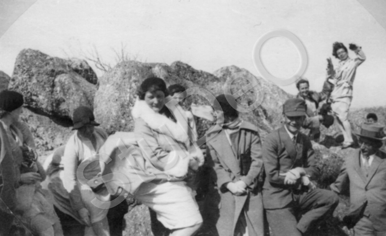 Beschreibung: Zum Vogelberg am Yang Tse Kiang. v.l.n.r. Annemarie Beelitz, Frrau Zimmermann, Erika und Tochter  Ilsemarie Simon-Eberhardt, Damen Lehmann und Frhr. V. Bock, Herr Haubs, dahinter Damen Welkoborski und Weber.