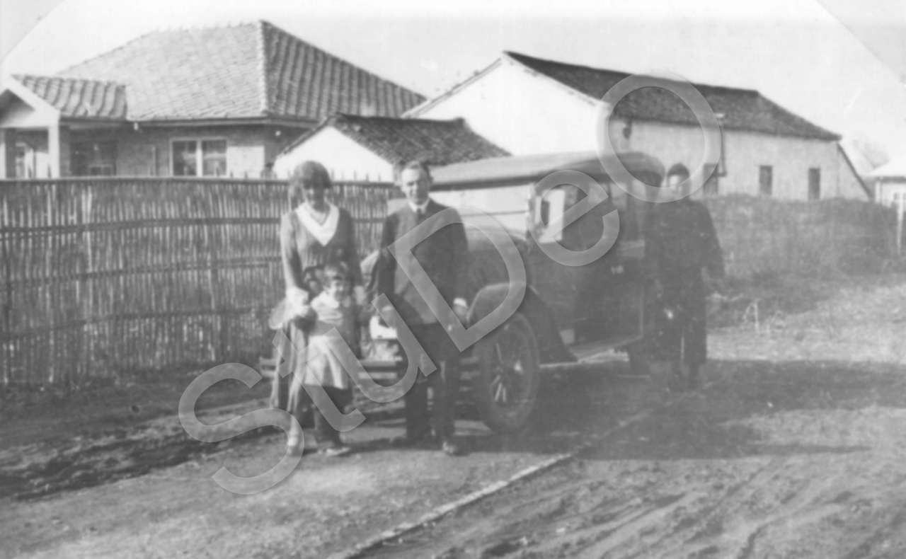 Beschreibung: Erika und Tochter  Ilsemarie Simon-Eberhardt und Wilhelm Lorenz (einige Wochen bei S-E. zu Besuch) vor dem  Rugby der Familie Max Simon-Eberhardt.